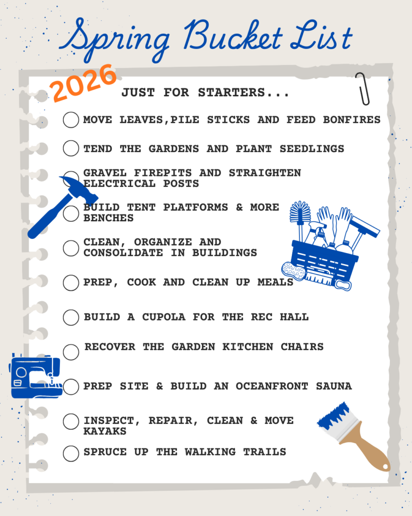 For our 32nd annual Ship Shape Weekend…and our plans fill a whole week. If time is tight, just come for the weekend and we’ll follow our traditional schedule but if you can stay a little longer and want to help, we’ve got all sorts of projects including gardening, landscaping, tending bonfires, cleaning windows and expanding the trails. May is a fickle month so we know we’ll be working around the sunny hours…we ask that you come and be part of the family…together we’ll figure out what can get done and how we’ll do it. Bring your tools. We’ll make certain that no one goes hungry or overworks