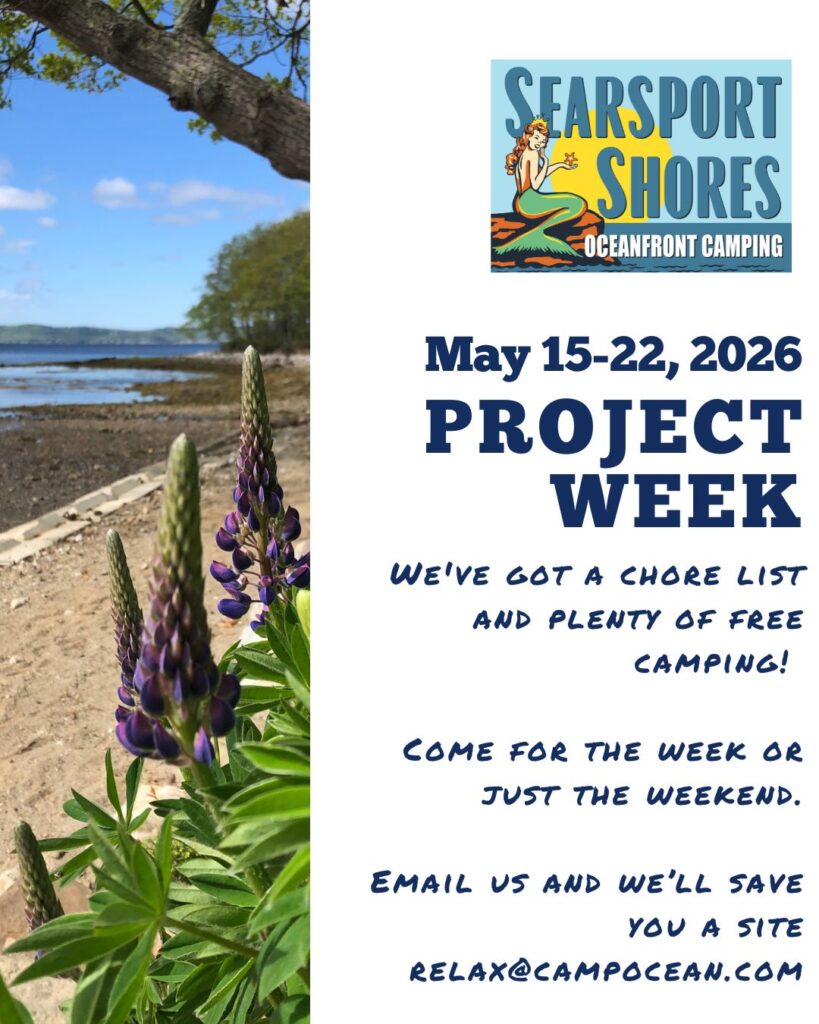 P.S. If you can stay longer, we invite you to be part of our family crew…we’ll keep a warm pot of chowder or chili on the woodstove and we’ll keep going on projects. We ask that you work 4 hours for your campsite and if you want to stay for Memorial Day weekend, make certain that we know so that we can accommodate everyone without site confusion.
